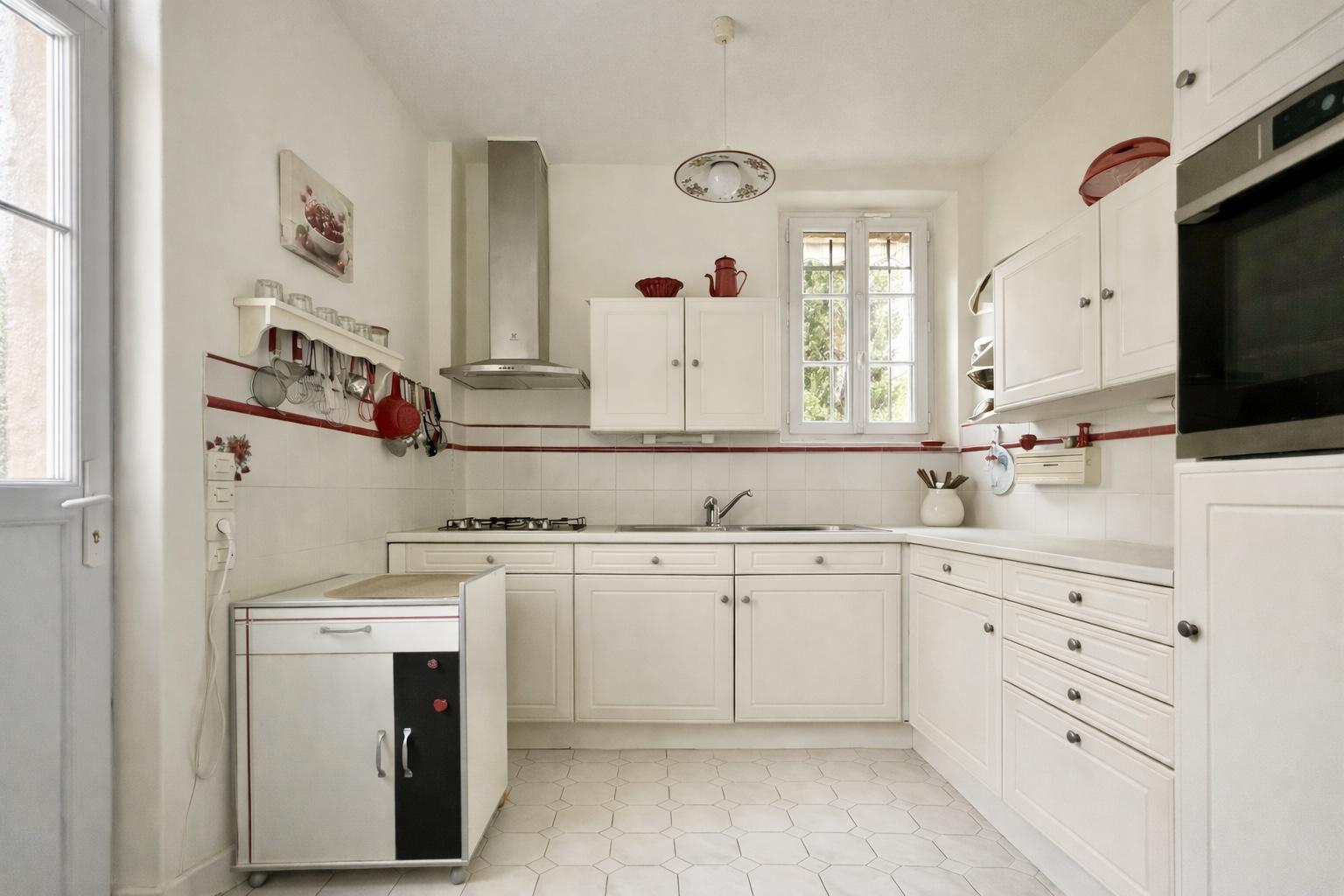 Dès l’entrée, vous découvrez un salon-séjour agrémenté d’une cheminée d’époque, apportant charme et caractère à l’ensemble. La cuisine indépendante et équipée s’ouvre sur l’extérieur, idéale pour profiter des beaux jours.
