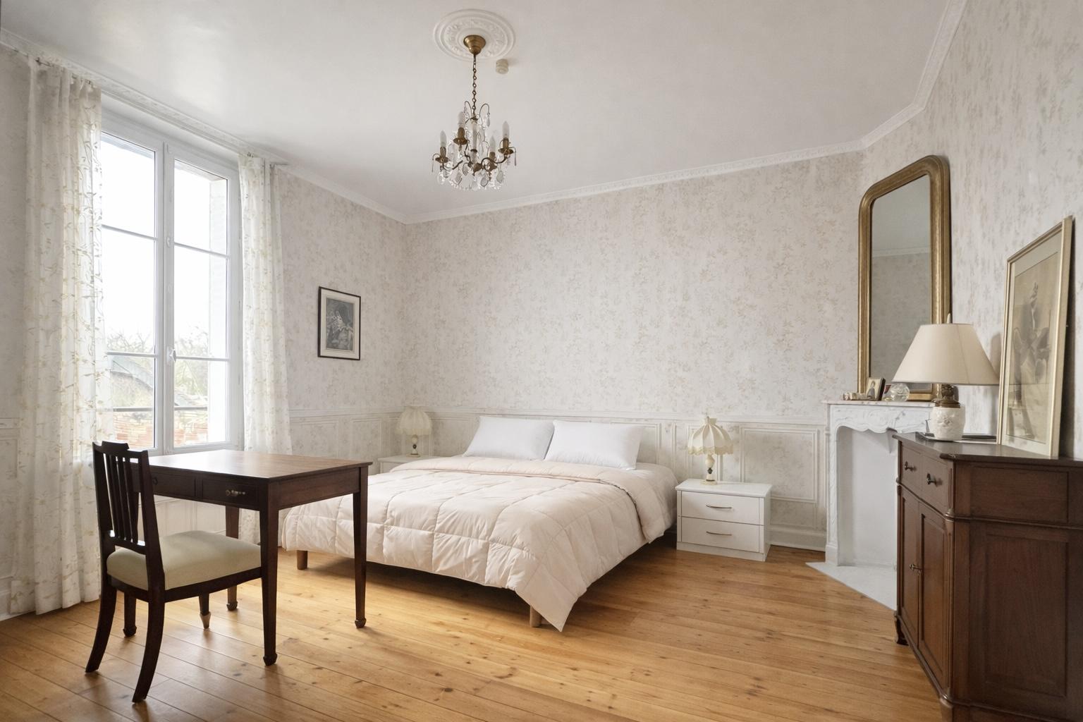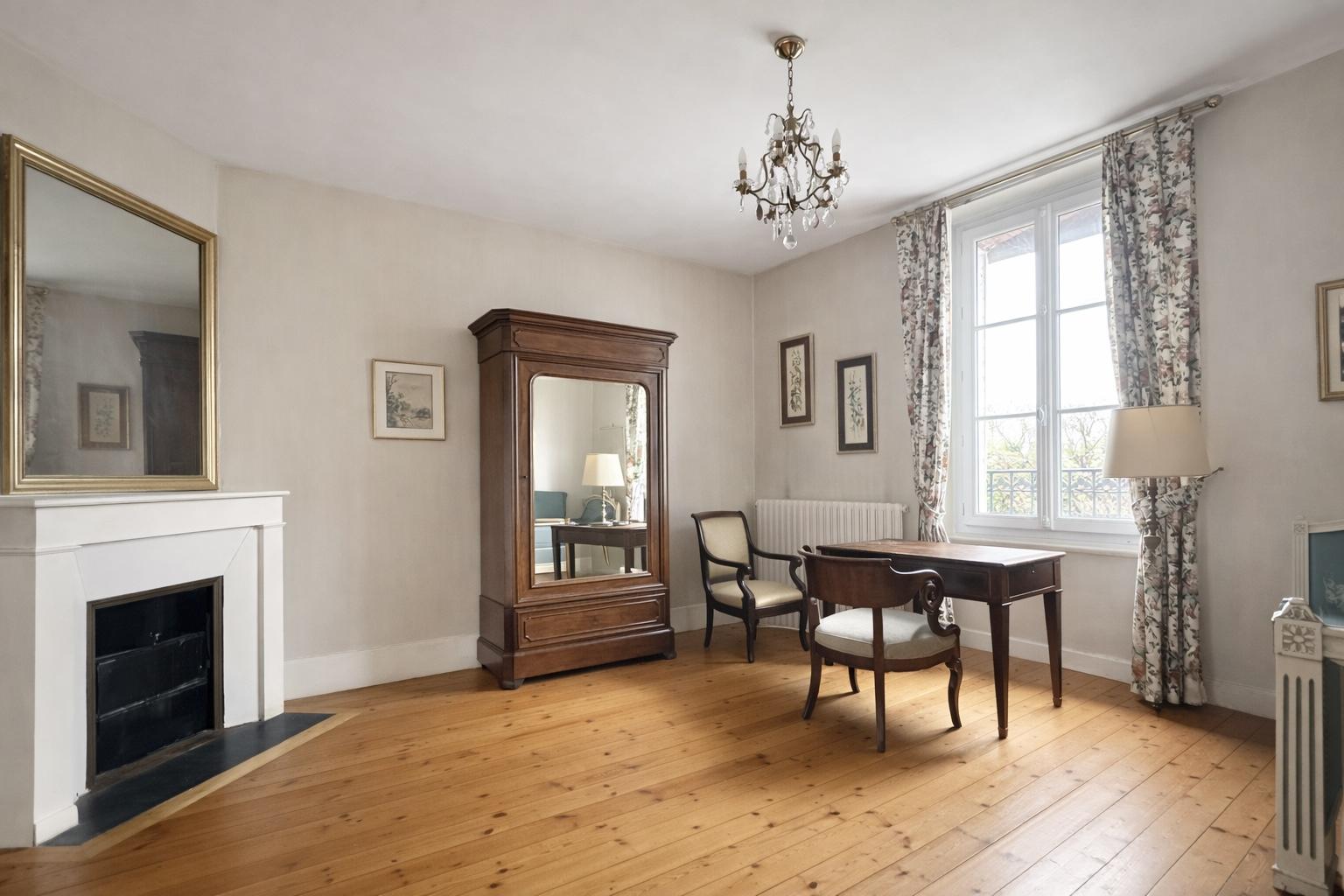 Au 1er étage, deux belles chambres disposent chacune de leur cheminée ancienne, accompagnées d’une salle de bain et d’un WC indépendant.